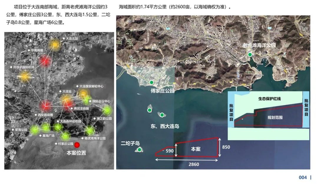 项目位置:大连南部海域,距离老虎滩海洋公园约3公里,傅家庄公园3公里,东、西大连岛1.5公里,二坨子岛0.8公里,星海广场6公里