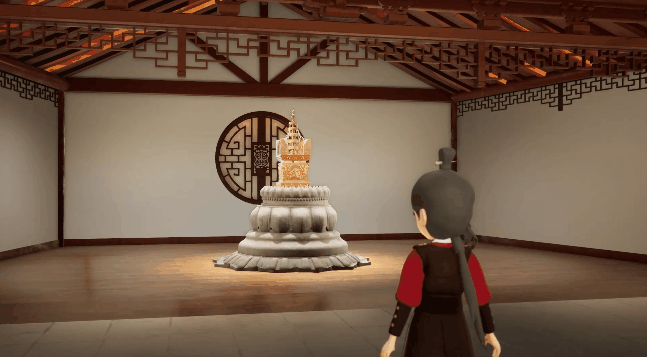 接着,进入“报恩圣境元宇宙”,用自己的虚拟形象开启奇妙之旅。互动体验共分为“千年对望”“琉璃拱门”“报恩圣境”“宝塔奇缘VR互动”等八关。这八关分别与博物馆中八个景点相对应,拿着手机走到景点附近,就会触发互动。