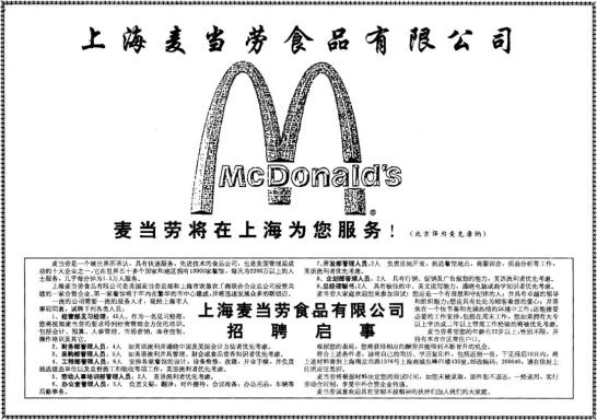麦当劳的招聘启事此时的肯德基“独领风骚”,距离麦当劳在光明邨一楼的位置开出第一家店还有5年时间。