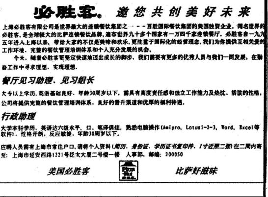 招聘对英语的要求还是挺高的1996年,必胜客在中山公园开了上海第二家店。最初的这几家“必胜客比萨饼餐厅”有点“端着”。