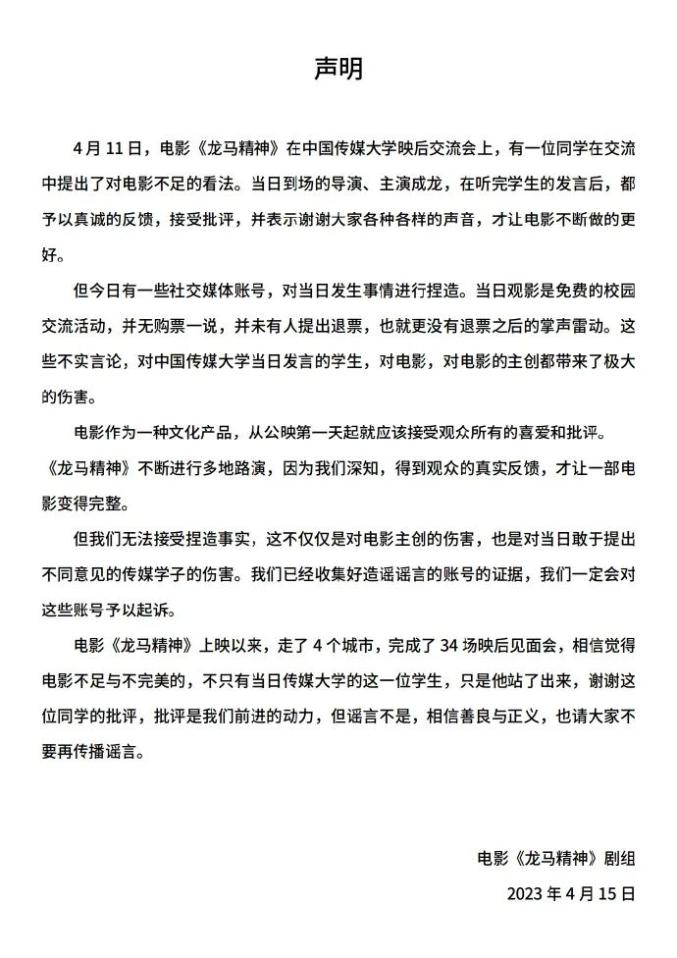 4月15日,@电影龙马精神回应称,“批评是我们前进的动力,但谣言不是。”并附上声明。