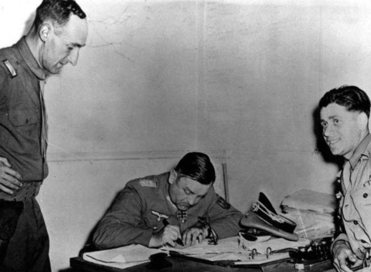 ◇ 正在签署投降书的肖尔蒂茨到了2月25日,法国军队一马当先,盟军冲进城,肖尔蒂茨也成了俘虏,直到最后,理论上讲只要他一句话,巴黎就可以化为火海,但他没这么做,巴黎也得以保全。当天希特勒非常关心巴黎的情况,不断在问,巴黎烧了么,后来有人告诉他真相,希特勒上演了一出元首的愤怒,判处缺席的肖尔蒂茨将军死刑,并准备找他妻儿的麻烦,此时盟军也没有食言,他的妻儿已经被安全地转移走了,而肖尔蒂茨在战俘营里呆了两年多,在1947年重获自由。