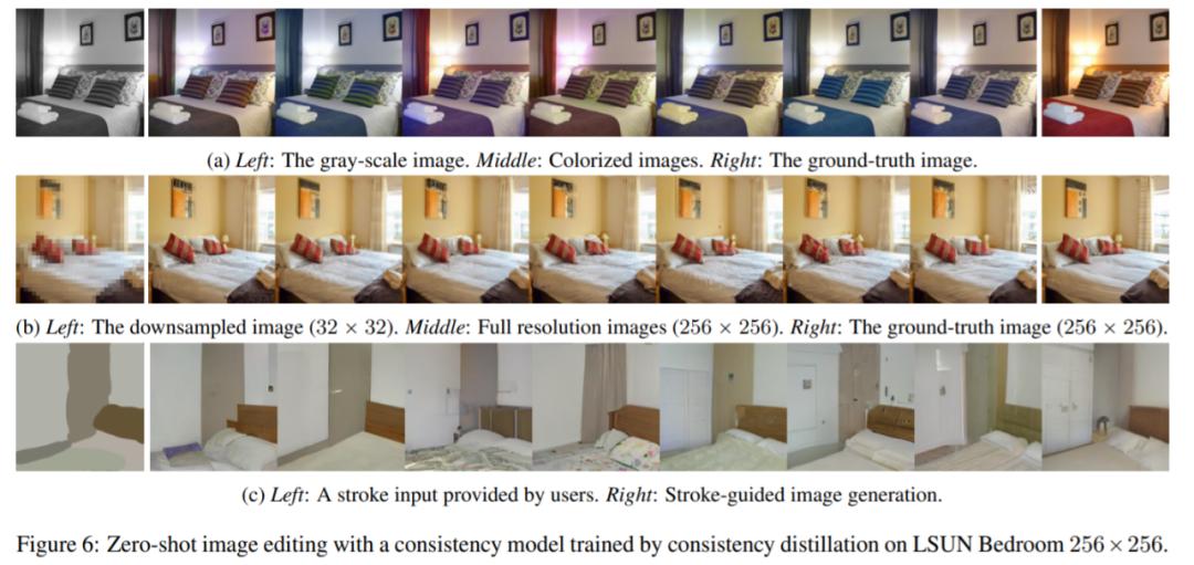 具体而言,Consistency Models 支持快速 one-step 生成,同时仍然允许 few-step 采样,以权衡计算量和样本质量。它们还支持零样本(zero-shot)数据编辑,例如图像修复、着色和超分辨率,而无需针对这些任务进行具体训练。Consistency Models 可以用蒸馏预训练扩散模型的方式进行训练,也可以作为独立的生成模型进行训练。