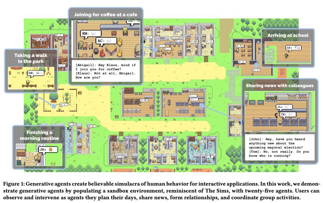 25 个智能体居住在名为 Smallville 的小镇,每个智能体由一个简单的化身表示。所有的角色都可以:与别人和环境交流;