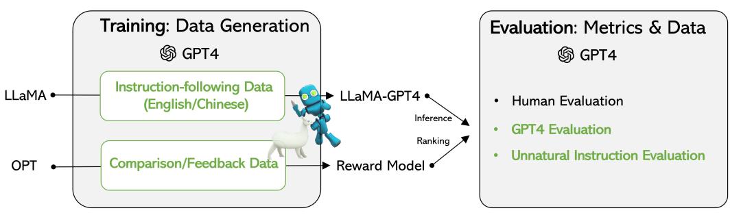 另一方面基于 GPT-4 生成的数据开发了指令微调的 LLaMA 模型和奖励模型。为了评估指令微调 LLMs 的质量,研究者使用三个指标对测试样本进行评估:对三个对齐标准的人工评估、基于 GPT-4 反馈的自动评估以及非自然指令的 ROUGE-L(自动文摘评测方法之一)。