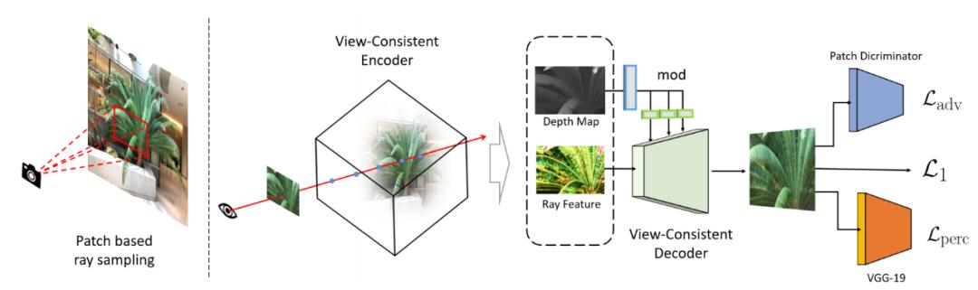 4K-NeRF pipeline(如下图):使用基于 patch 的射线采样技术,联合训练 VC-Encoder(View-Consistent)(基于 DEVO)在一个较低分辨率的空间中编码三维几何信息,之后经过一个 VC-Decoder 实现针对高频细高质量的渲染与视图一致性的增强。