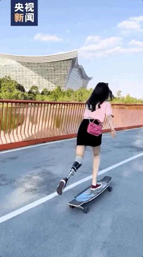 一个女孩正在街头踩着滑板,她看上去身姿矫健、动作也格外的娴熟。可让人震惊的是,她的左腿是一条金属的假肢。