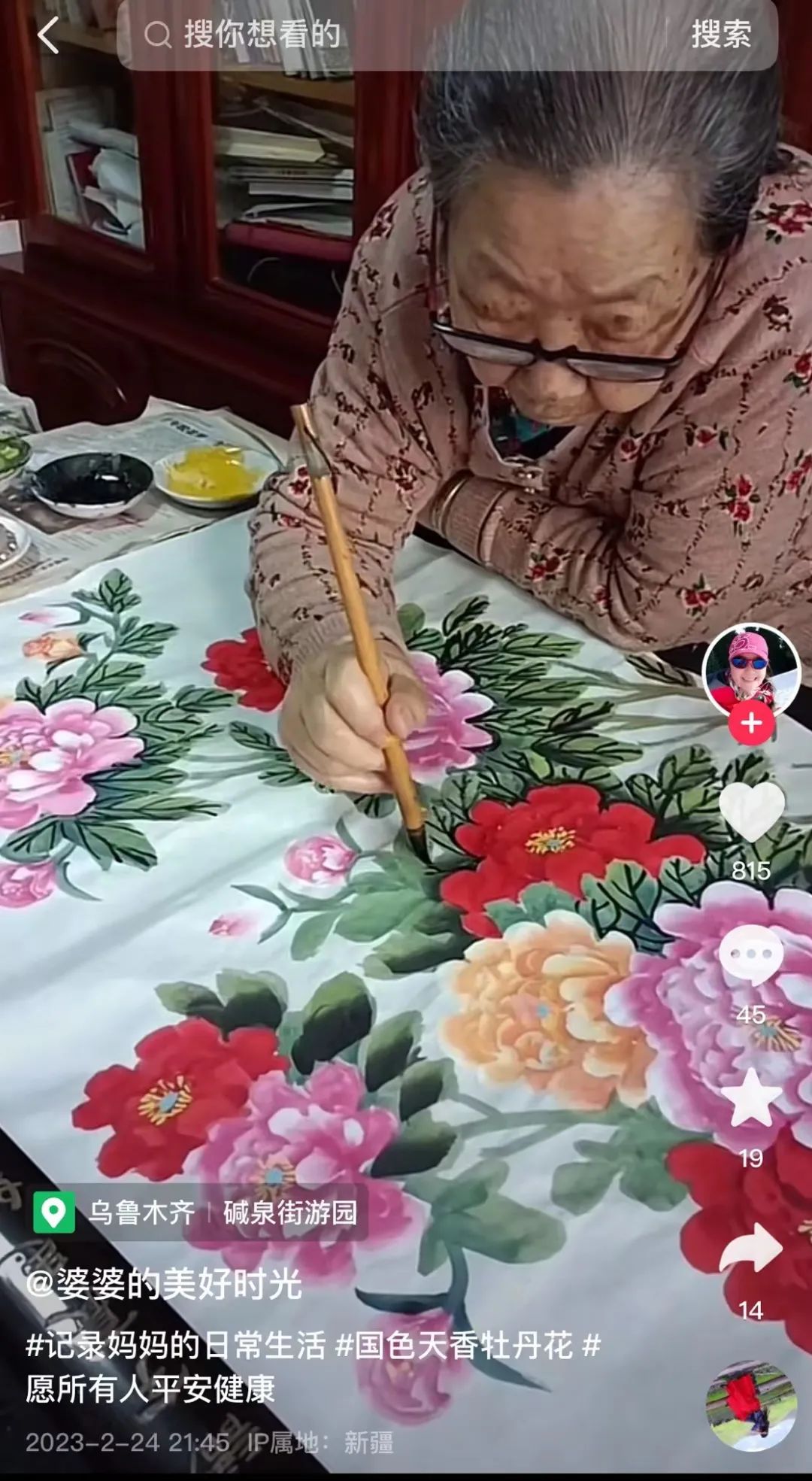 一位叫@婆婆的美好时光的网友,在抖音上分享了她婆婆作画的日常: