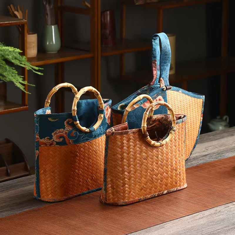 △竹编印花复古手提包