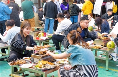 “与其他地方的撸串不同,淄博烧烤让人亲自动手在小烤炉上边烤边吃,极具参与感。”山东大学大一学生张安迪与朋友专程来淄博市张店区品尝烧烤。