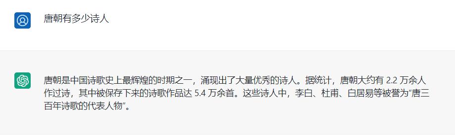 因此,ChatGPT对于唐诗总数的回答是基本准确,而对唐朝诗人数量的回答不一,前后相差十倍,第一个回答 “2.2万余人作过诗”,是第二种回答“两千多位”的近10倍。