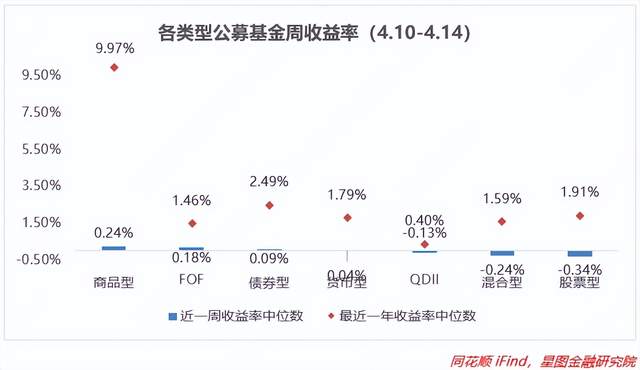 上周基金收益率中商品型基金周收益率中枢依旧最高,但仅0.24%,环比-1.76pct,主要是外围股指在周内的表现不及前周,上涨出现乏力。QDII型和股票型基金周收益率环比同样大幅走低,相关底仓资产表现不及预期;FOF型和混合型基金的收益率中枢介于所有类型之间。商品型基金年收益率中枢同样领涨,但是下滑幅度也是最大,除此之外的基金年收益率中枢都在转好。货基变化不大。