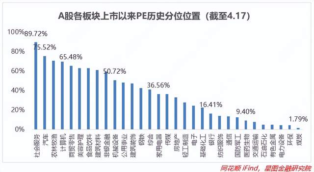 从上市以来板块分位值来看,截至4月17日收盘,21个板块估值上修,估值分位数平均上升1.37pct。计算机估值回升最大,环比+11.48pct;大金融板块整体表现不错,建筑装饰、家电、非银、银行涨幅靠前;此外消费继续调整,包括美容、食饮、社服、纺织在内的板块估值持续回落。板块估值中位数为传媒(36.28%),依旧处于抬升通道。