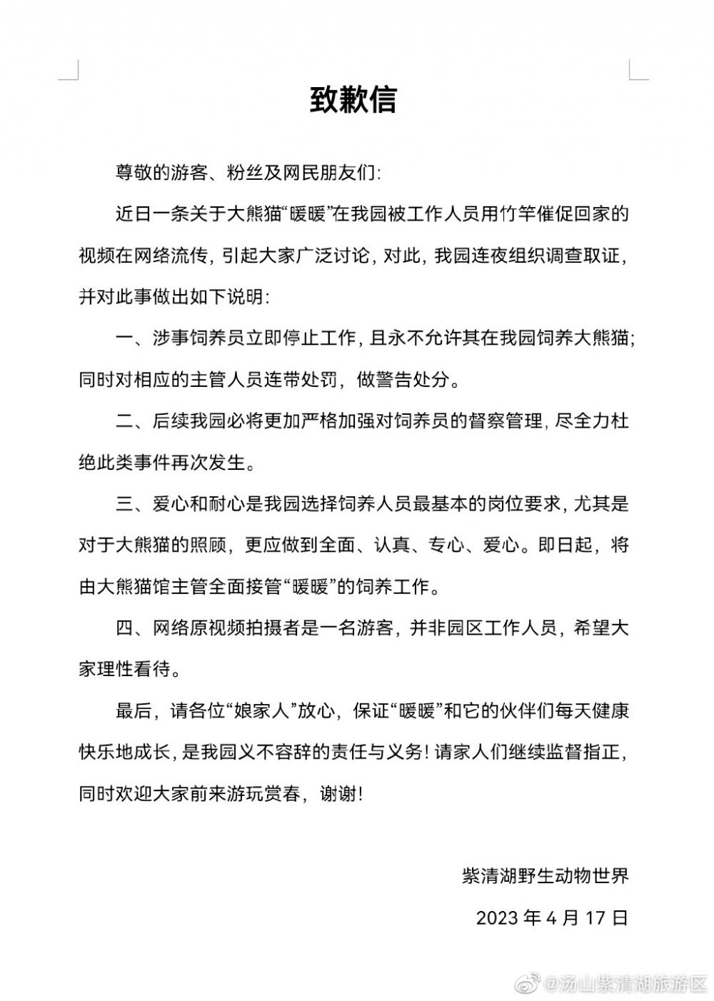 网传视频称,大熊猫“暖暖”下班沉迷吃笋,被饲养员用竹竿拍打催促,旁边游客大笑,从而引发热议。17日,紫清湖野生动物世界公开发表致歉信称,涉事饲养员立即停止工作,且永远不允许其在园区饲养大熊猫,同时,对相应主管人员连带处罚,做警告处分。后续,将加强对饲养员的督查管理。