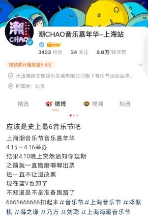 与此同时,音乐节频繁的延期或取消,也会令乐迷们更加慎重选择观演,乃至不再为此消费。比如,即便潮CHAO音乐嘉年华作为猫眼文旅旗下音乐节活动品牌,有着足以获得受众信任的平台背书,也不免被拉入乐迷的避雷名单。而其官方账号的“蓝V认证”也在4月11日被指卸下,令不少乐迷担忧其也将“跑路”。