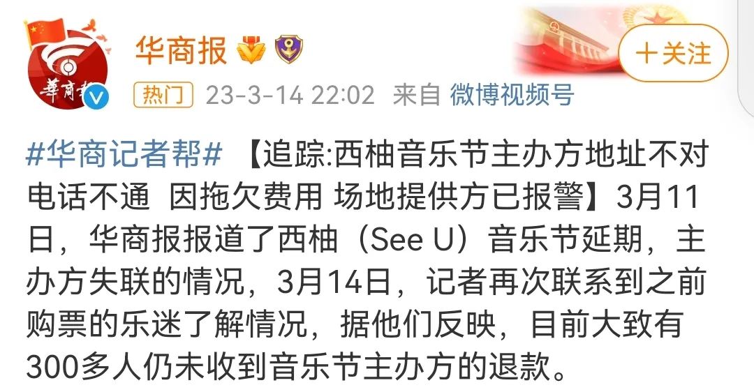 眼下,音乐节退款难已经普遍化,西柚SEEU音乐节、耳浪音乐节、无尽星空跨年夜音乐节等均是如此。据悉,西柚SEEU音乐节在乐迷报警后,曾承诺在3月10日退款,却至今仍未处理完成,乐迷赵小姐便表示,“西柚的票价在388元至千元不等,起码有十几万元没退。”