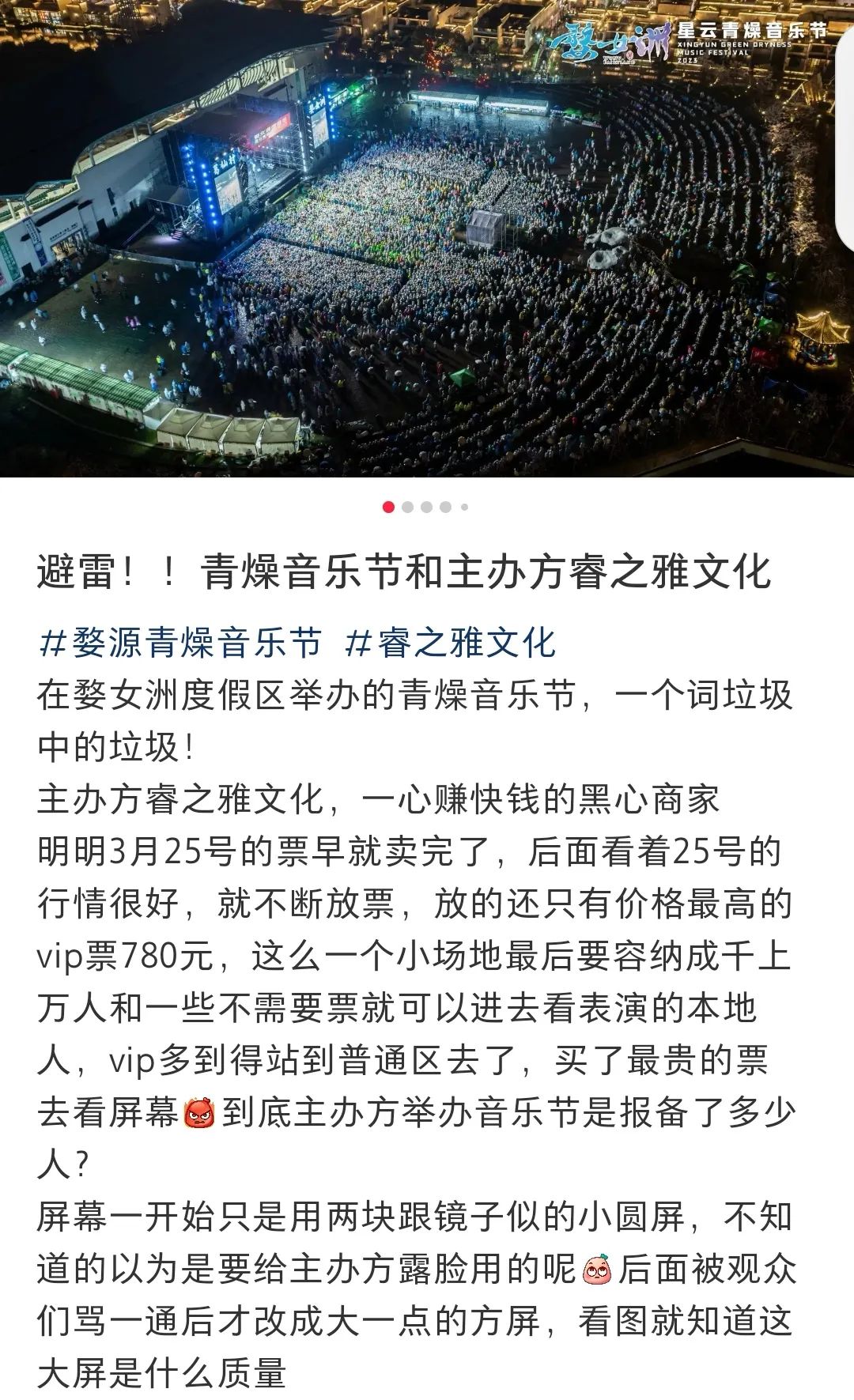 在音乐节加速遍地开花的过程中,不少音乐节糟糕的现场体验也让不少新生音乐节被乐迷吐槽为“房地产拼盘商演”、“群星演唱会”。在3月18日的武汉麦田音乐节中,脆莓乐队因迟到半小时左右、人声听不清楚引发乐迷不满,而同一场的沉默橙乐队也因下雨造成的设备泡水、音响调音出现问题,不得不延迟开演20分钟。无独有偶,广州海潮宇宙音乐节、芒禾音乐节等也同样因音响问题、舞台较小、演出迟到等问题备受乐迷吐槽。