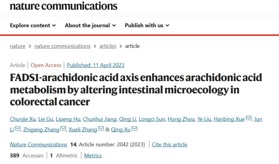近日,上海交通大学仁济医院徐庆、薛寒冰和上海交通大学上海市肿瘤研究所张雪莉、张志刚、李军等人近日在《Nature Communications》发表研究文章,阐明了FADS1-AA轴通过调节革兰氏阴性菌的肠道微生态促进CRC发展的新机制,揭示了肿瘤细胞和肠道微生态学间复杂的相互作用,并提示FADS1-AA轴或可作为CRC治疗的潜在靶点。