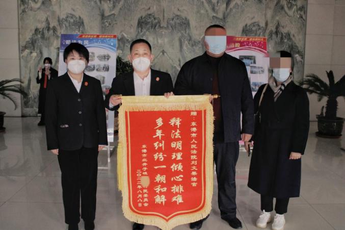 释法明理形成工作合力。在案件审理过程中,东港市人民法院积极争取地方党委支持,坚持法官、律师联动调解,近期,成功调解一起长达8年的渔业承包合同纠纷案件,取得了良好的法律效果和社会效果。村民委员会工作人员带着一面印有"释法明理心排难,多年纠纷一朝和解"的锦旗来到东港市人民法院,表达对法官的由衷感谢和对法院工作的高度认可。