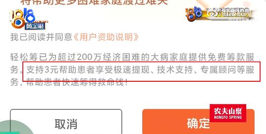 关于上面提到的“支持3元”一事,几天前有另外一则报道。4月13日,有网友向记者反映在轻松筹大病筹款平台捐款时的遭遇,网络捐款5元,结果却被平台扣费8元,另外3元成了捐给平台的“手续费”。该网友质疑平台收费不合理。