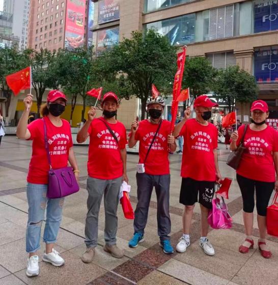 ●去年开始,几位家长联合起来、走遍近二十座城市宣传网络游戏危害。讲述者供图那也是家长们斗志满满的一年。他们穿着印有反游标语的大红T恤,手持小旗,三个月内连走十六城进行反游宣传;安徽芜湖,他们说服了上百人的广场舞队伍穿上他们的红色T恤;江西南昌的酷暑天气里,当他们淌着大汗把传单塞进一辆停在路边的警车时,对方摇下车窗递来几瓶水,玲感动得差点哭出来,“这说明我们做的事情是对的!”