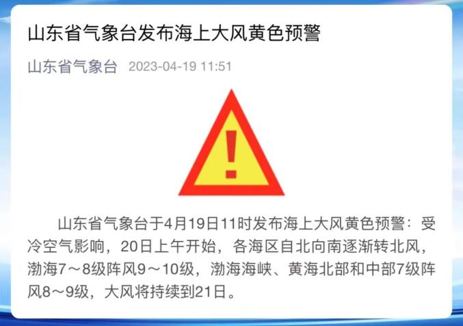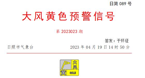 日照市气象台2023年04月19日14时50分发布大风黄色预警信号:受冷空气影响,预计20日午后开始,我市北到东北风风力逐渐增强到内陆5级、阵风7~8级,沿海及近海海域6级、阵风8级,海上6~7级、阵风9级,大风将持续到21日。防御指南: