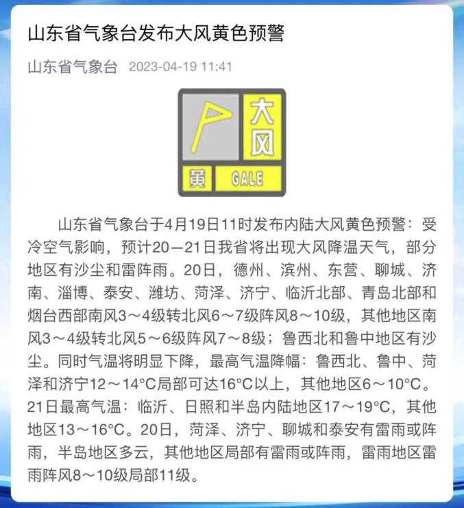 20日,德州、滨州、东营、聊城、济南、淄博、泰安、潍坊、菏泽、济宁、临沂北部、青岛北部和烟台西部南风3~4级转北风6~7级阵风8~10级,其他地区南风3~4级转北风5~6级阵风7~8级;鲁西北和鲁中地区有沙尘。