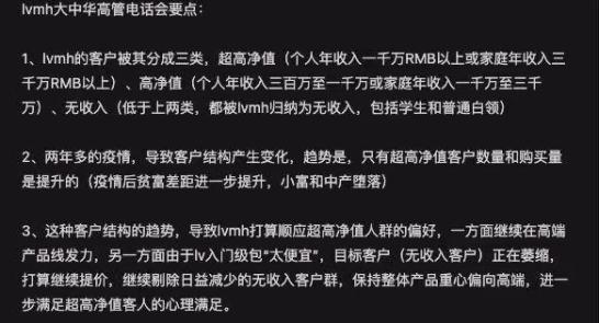 在去年4月一份广为流传的会议纪要里,LVMH为核心的高净值人群定下一个堪称苛刻的门槛:个人年收入300万以上,或家庭年收入1000万以上。