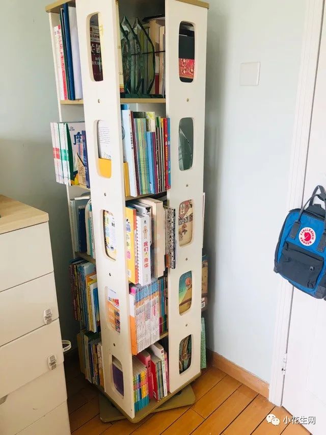 最后一个,第四书架,半封闭式的。这个其实是我们家第一个书架,之前是放大人的书,有了孩子之后,一点点腾退挪地方。现在主要是放一些练习册,数学类的绘本在这里做了汇总,上一个阶段替换下来的书,属于一个强有力的后备资源。旋转型的书架其实容量还很大的,感觉也还算挺稳的,但是考虑到家里有小朋友,还是放在了一个角落里,能够更安全一些。壮宝有时候自己就把书房门一关,坐在这里翻翻书。