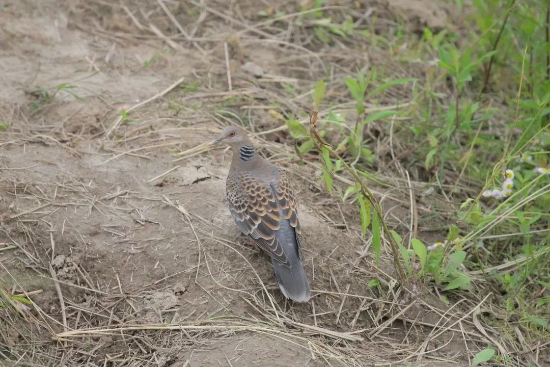 山斑鸠| 何鑫 摄在它的脖子上没有珠颈斑鸠那所谓的“珍珠项链”斑点,取而代之的是几道黑白相间的纹路。而且从背面看,山斑鸠的的羽毛边缘常常有清晰的红褐色边缘,就像龟壳的纹路一般,这也使得在英文中被称为Oriental Turtle Dove。