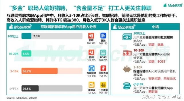 如果从用户角度来看,脉脉和猎聘的用户确实有一定重合。以月收入为例,据Mob研究院发布的《2022年互联网招聘求职行业洞察报告》显示,月薪2万元以上的求职者更喜爱使用猎聘和脉脉。
