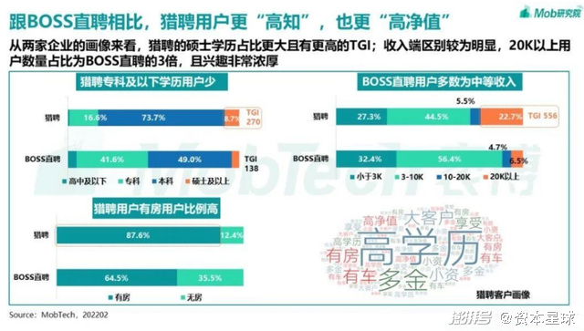 但不可否认的是,猎聘平台上用户更“高知”,该平台上硕士学历占比更大且有更高的TGI,收入2万元以上用户数量是BOSS直聘的3倍,且87.6%的用户拥有自己的住房。