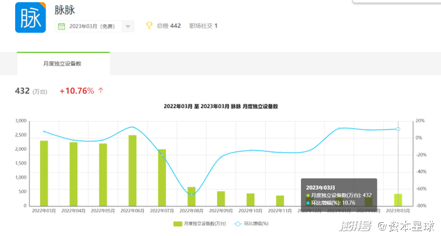 首先,是用户体量的问题。艾瑞咨询数据显示,截止到2023年3月,BOSS直聘月度独立设备数为4174万台,智联招聘和前程无忧都在1900万台左右,猎聘也达到了790万台。而脉脉的月独立设备数,仅仅是432万台 。