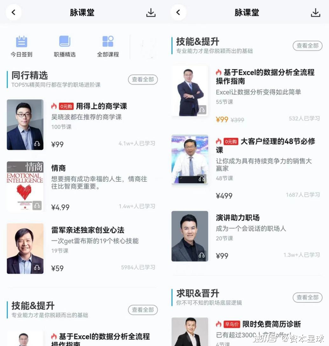 “脉课堂”则针对求职晋升、技能提升、管理成长等不同需求,上线66元到499元不等的培训课程。首页上销量最好的是标价99元的“用得上的商学课”,有4.1万人学习。标价4.99元的“情商”,则有1.4万人学习。二者相加,5万余人的学习数据,显然很难为脉脉带来可观的收益。