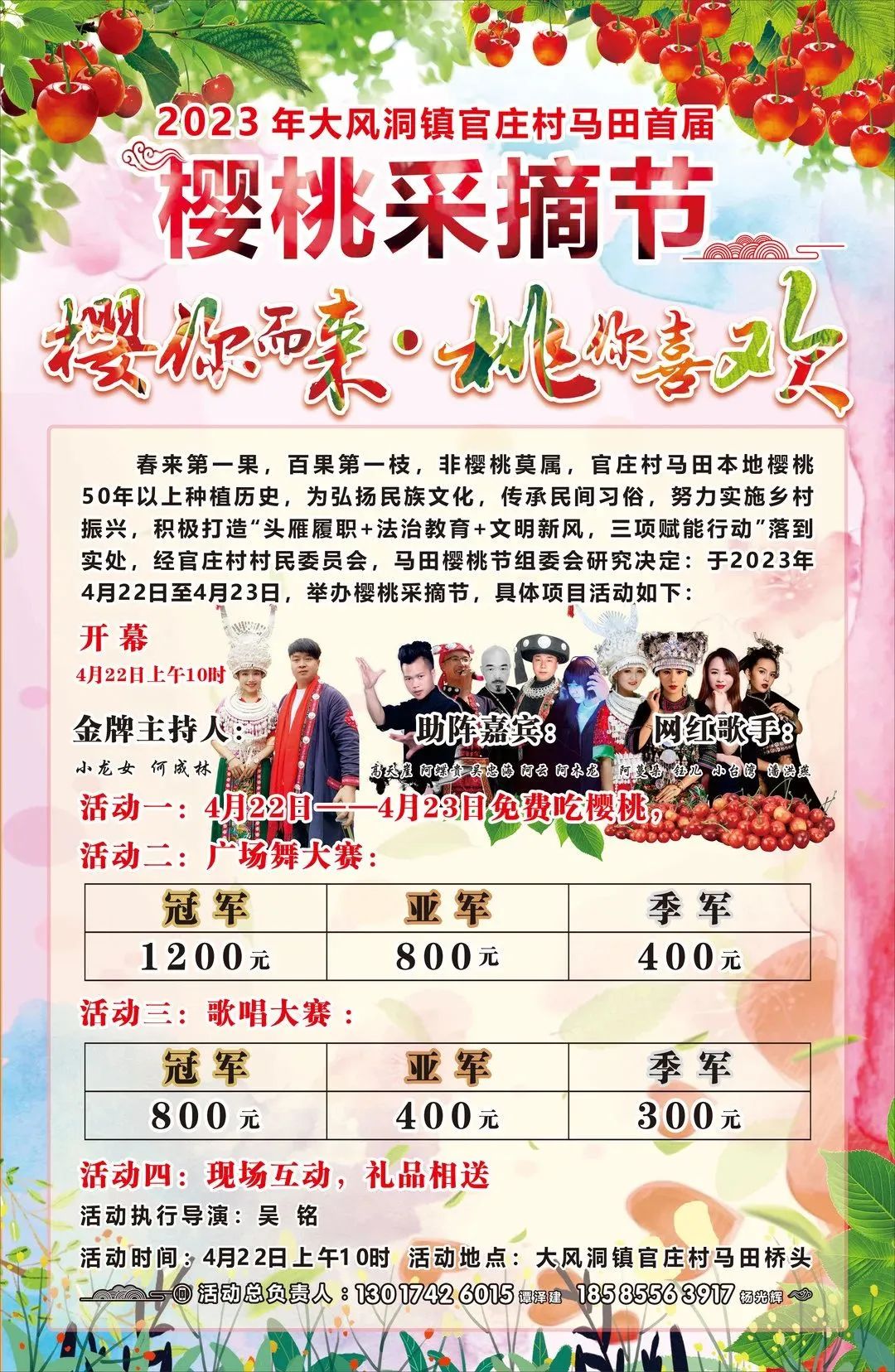 本次樱桃采摘节以“樱你而来,桃你欢喜”为主题,于4月22日至4月23日举办,时间为期2天,开幕式将于4月22日早上十点举行。樱桃节期间,樱桃免费吃、可观看广场舞大赛、唱歌大赛等活动。