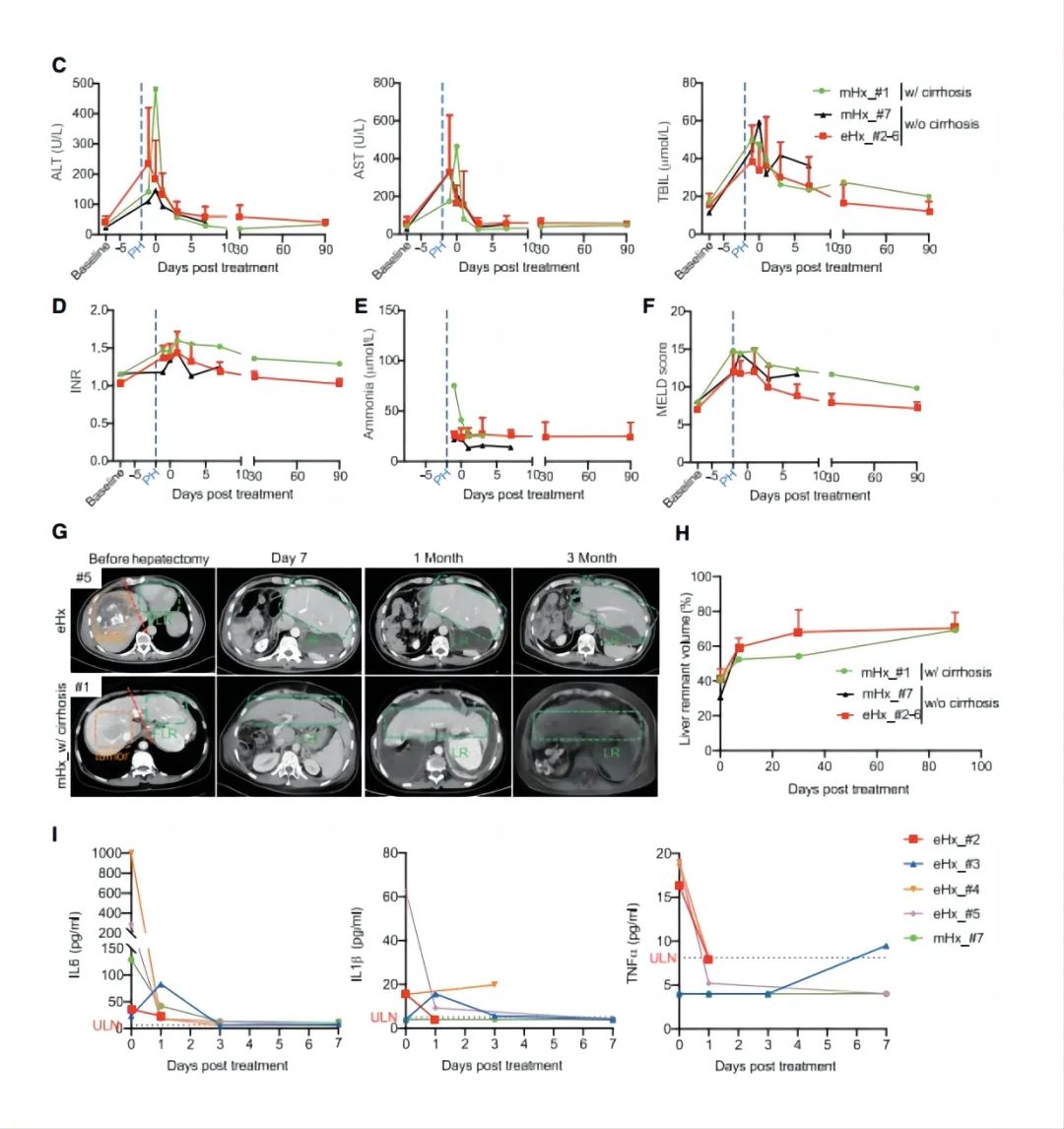 值得注意的是,大肝切患者在hiHep-BAL治疗后,肝损伤指标ALT、AST和TBIL下降,凝血功能指标INR等改善,肝性脑病重要诱因血氨水平降低,炎症指标IL6等下降,以及肝脏再生指标肝体积增大。揭示了hiHep-BAL具有治疗术后肝衰的潜力,这让原本存在肝衰风险而不适合肝切治疗的患者看到手术医治的希望。