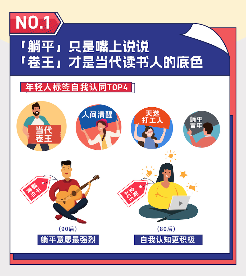 调研显示,年轻人自我认同TOP4标签为:当代卷王、人间清醒、天选打工人、躺平青年。