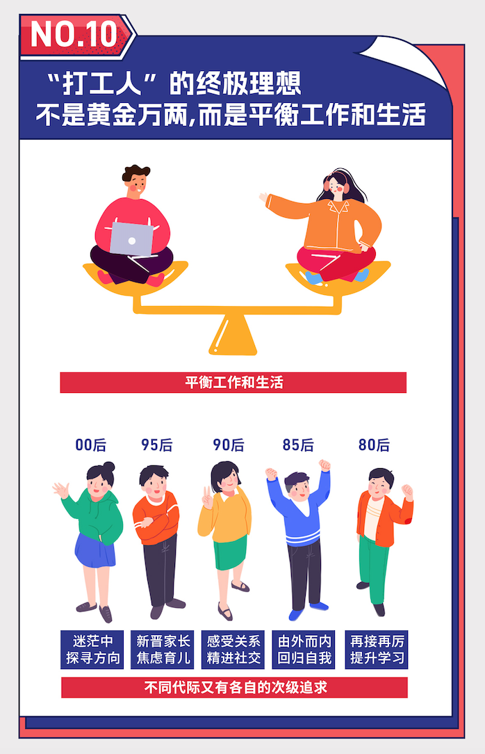 缺乏职业方向感是00后的普遍困惑;随着年龄的增长,“打工人”对职场的方向越来越明确;30岁左右的90后是心态情绪化最明显的时段;经过30岁这个坎,当工作和生活慢慢步入正轨,满意度逐步提升,年轻人的自我认同感会逐步增强。