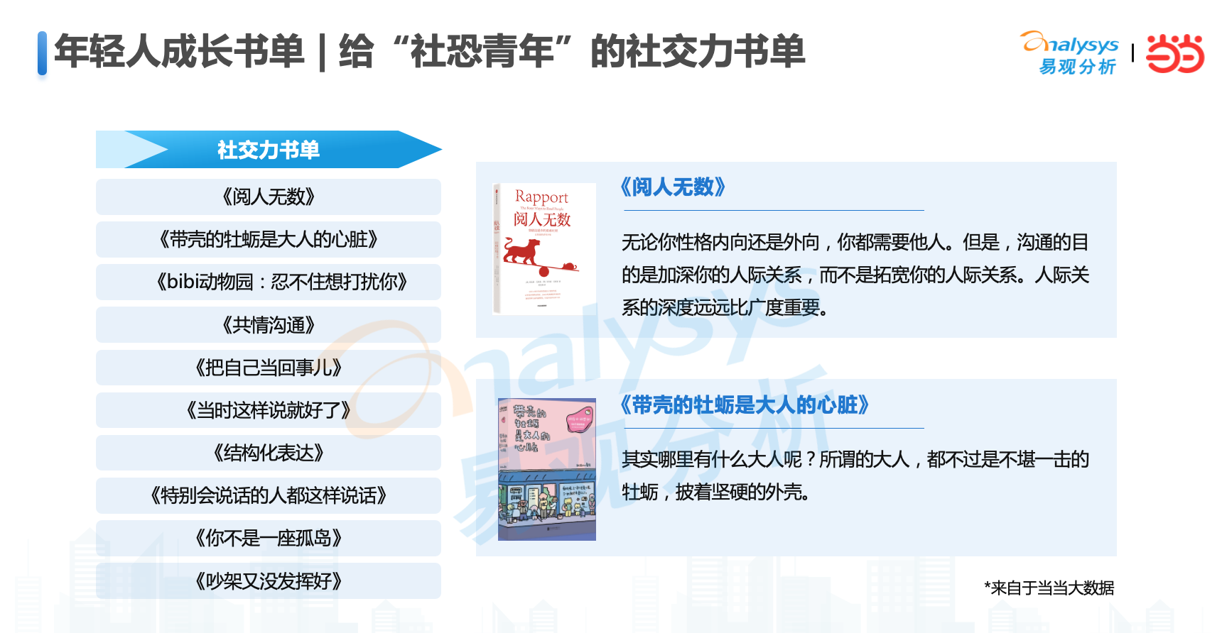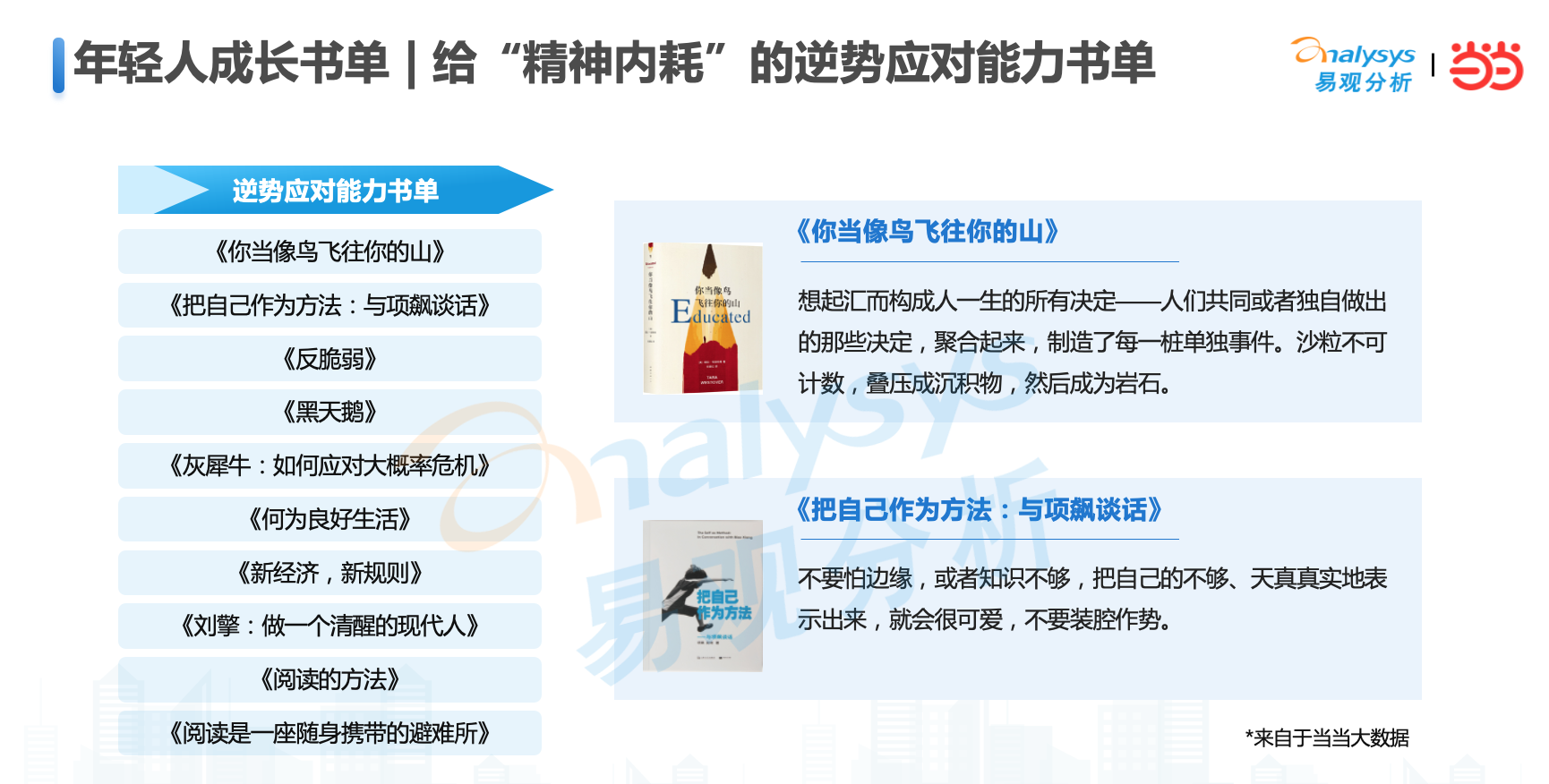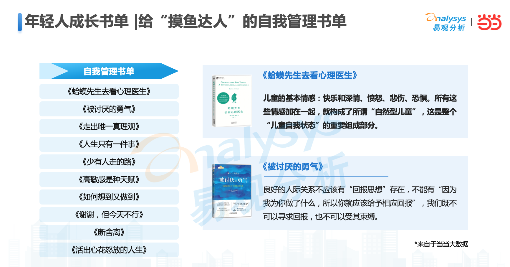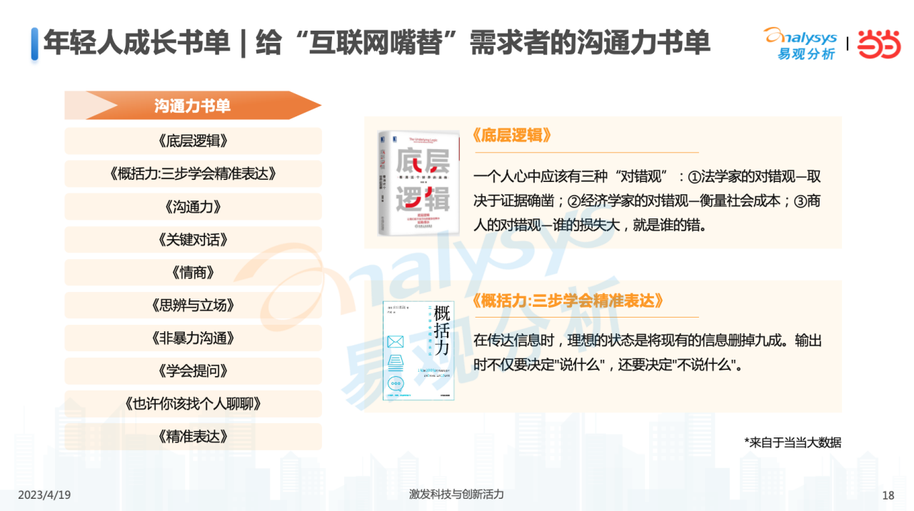 在今天这个时代,年轻人希望通过阅读在精神内耗的时候,给予自己以慰藉;在工作和生活中走入新阶段,新场景,遇到新问题时获得智者经验的传递和借鉴。当当网选品编辑,结合过去一年的社会热词,基于图书品质和热销指数的综合评估,在世界读书日为年轻人推荐了“成长书单”。