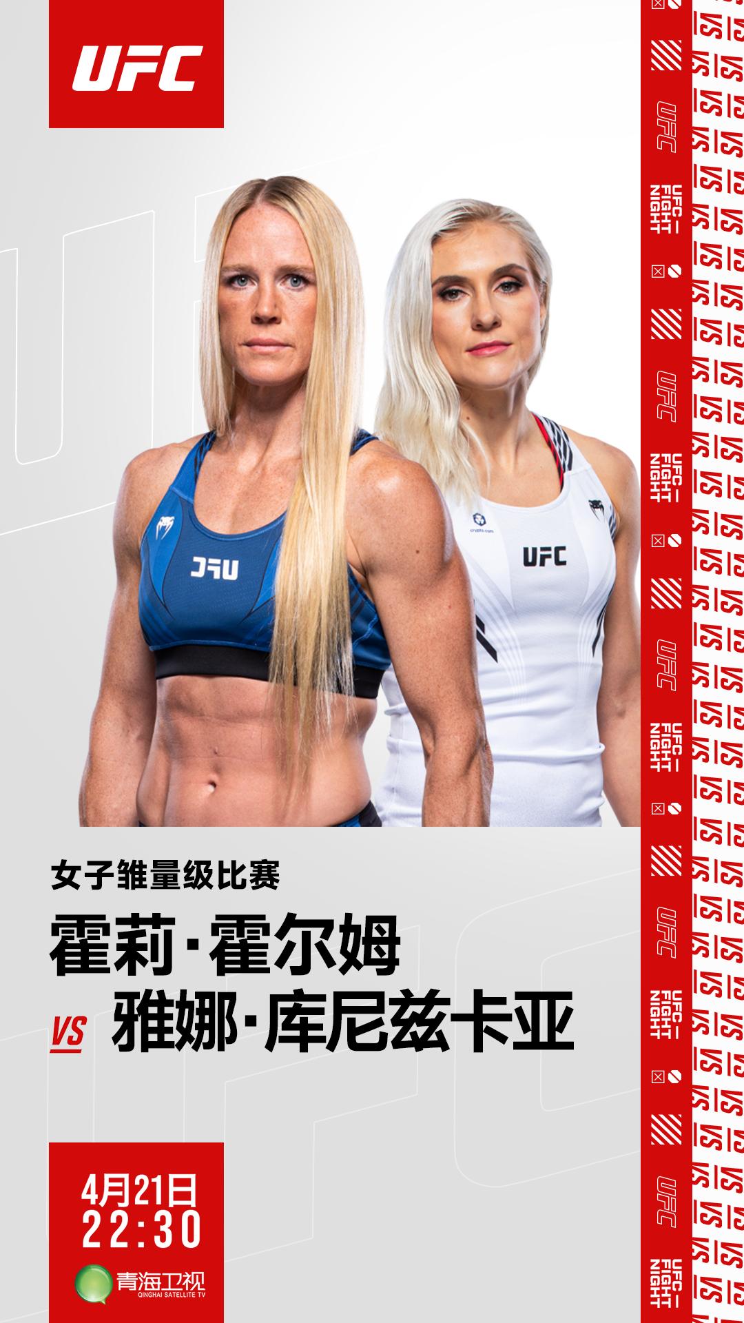 2023年4月21日 22:30,本期青海卫视《龙斗之UFC》将为大家带来UFC格斗之夜的比赛,压轴大战将是一场女子雏量级五回合比赛,由霍莉·霍尔姆对阵雅娜·库尼兹卡亚!