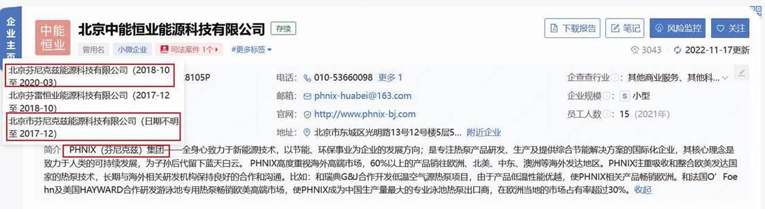 值得关注的是,北京中能恒业能源科技有限公司自成立以来曾两次使用带“芬尼克兹”的企业名称。工商信息显示,北京中能恒业能源科技有限公司自2008年成立至2017年12月曾用名为“北京市芬尼克兹能源科技有限公司”,此后在2018年10月至2020年3月曾用名为“北京芬尼克兹能源科技有限公司”。