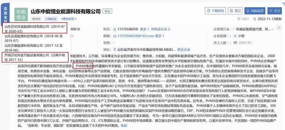 工商信息显示,山东中能恒业能源科技有限公司自2011年成立至2017年12月曾用名为“济南芬尼克兹节能设备有限公司”,此后在2019年7月至2020年3月曾用名为“山东芬尼克兹能源科技有限公司”。企查查APP显示的该企业简介为:“PHNIX集团——全身心致力于新能源技术,以节能、环保事业为企业的发展方向;集热泵、太阳能、风能等新能源领域产品开发、生产及提供全套解决方案的国际化企业……”(见图五)