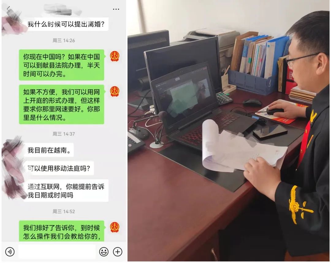 近日,献县人民法院本斋法庭利用在线诉讼平台审理一起跨国离婚案件。