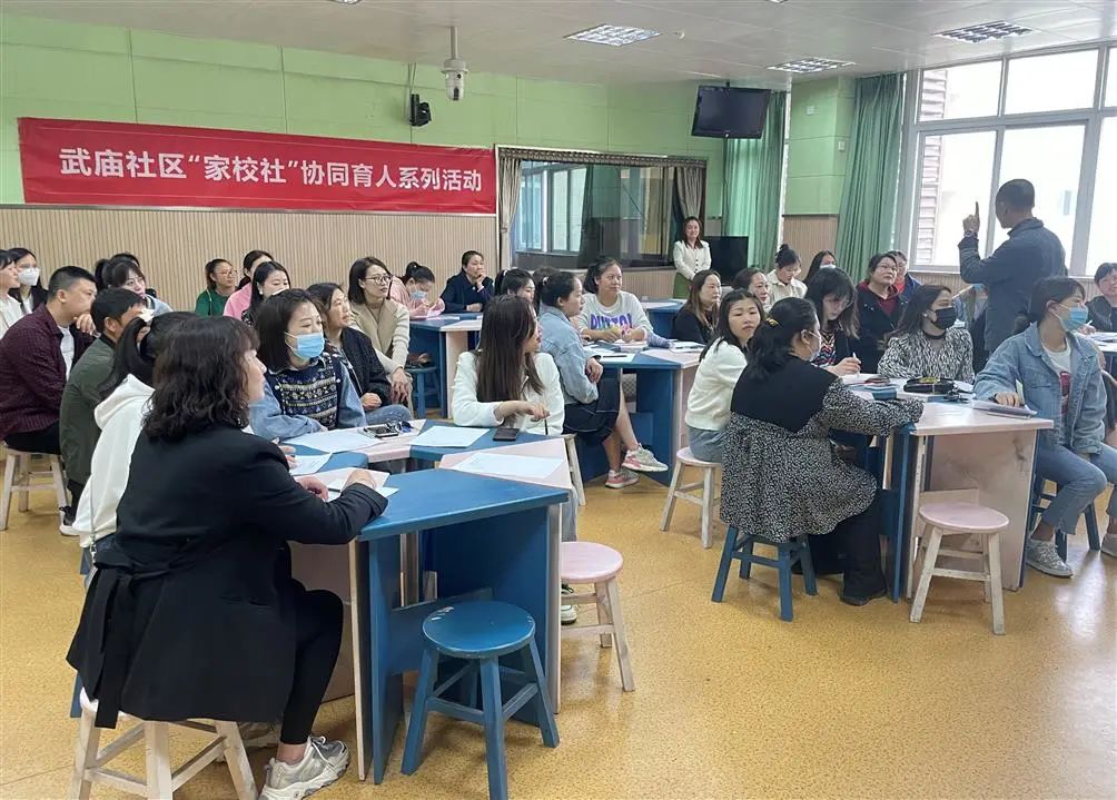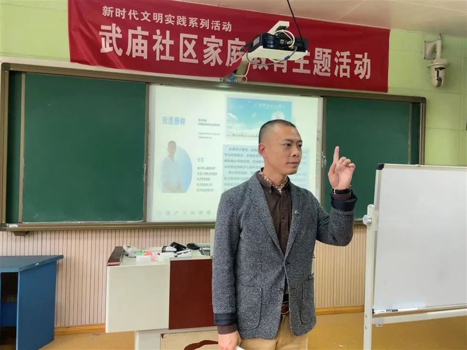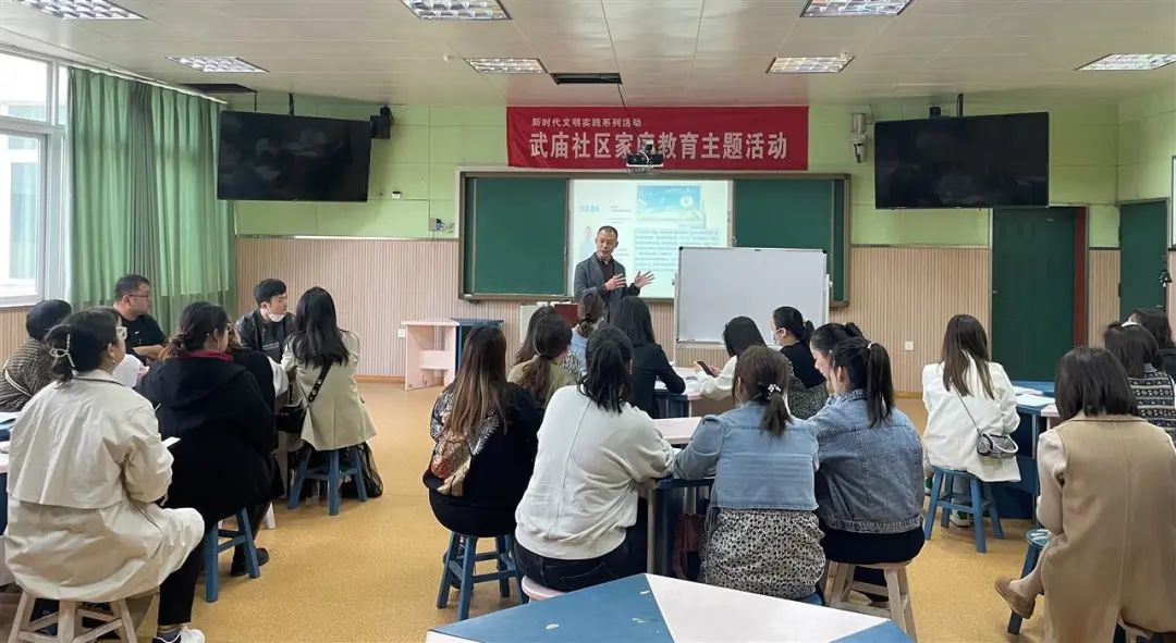 在新东方德阳天元烛光小学校,天元街道武庙社区联合四川映画武庙城市更新建设发展公司开展的新时代文明实践站系列活动之“家校社”协同共育家庭教育主题活动正在进行,授课老师以“亲子关系在孩子成长过程中产生的心理问题”为题,就“校园暴力霸凌现象”“孩子社交”“父亲模范作用”等方面进行讲解,通过理论讲解、案例分析、情景互动等方式,引导家长们正确保护孩子的自尊心和自信心,促进青少年心智健康发展。
