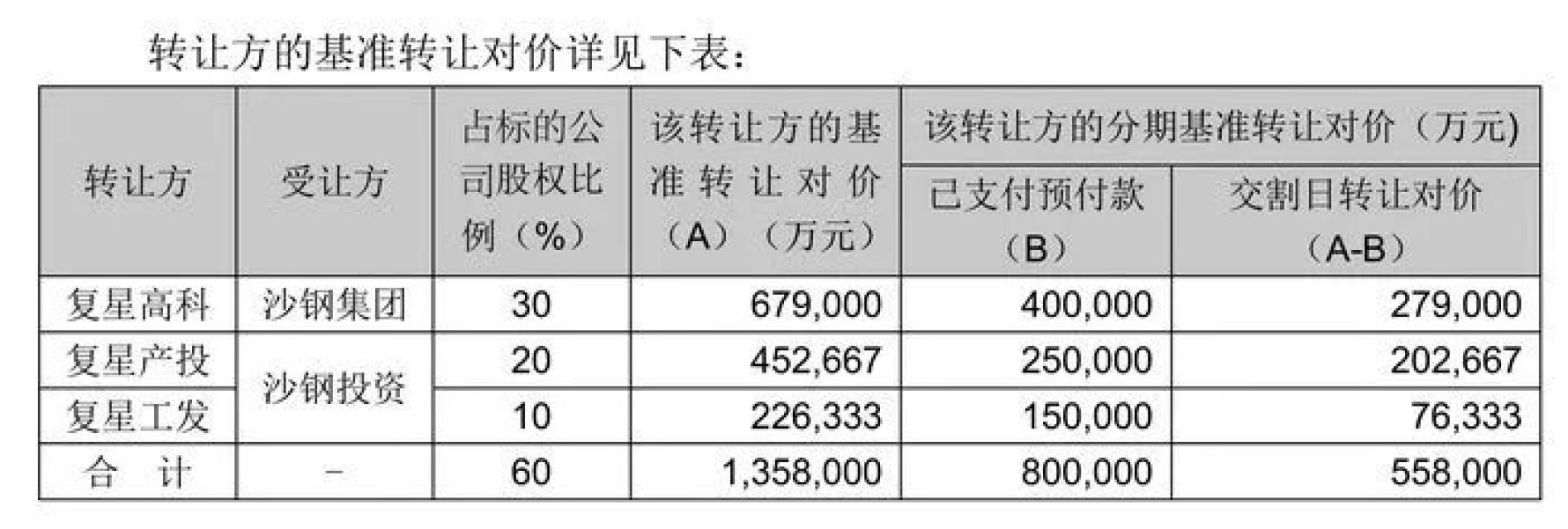 2023年3月,复星系3家公司与沙钢集团及其关联方沙钢投资达成转让协议,沙钢集团以135.8亿元价格受让3家公司持有的南钢钢联60%股权。同时,为推动南京钢联控制权转让交易,复星高科拟通过协议转让方式购买南钢股份所持有的万盛股份29.56%股权以及衍生的所有权益,转让价款为26.5亿元。