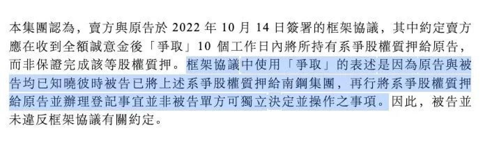 对此,复星国际认为,复星高科、复星产投及复星工发(以下合称“卖方”)与沙钢集团(原告)于2022年10月14日签署框架协议,其中约定卖方应在收到全额诚意金后“争取”10个工作日内将所持有系争股权质押给沙钢集团,而非保证完成该等股权质押。值得注意的是,复星国际在公告中特别指出:框架协议中使用“争取”的表述是因为沙钢集团与复星产投均已知晓彼时后者已将上述系争股权质押给南钢集团,再行将系争股权质押给沙钢集团并办理登记事宜并非复星产投单方可独立决定并操作之事项。因此,复星产投并未违反框架协议有关约定。