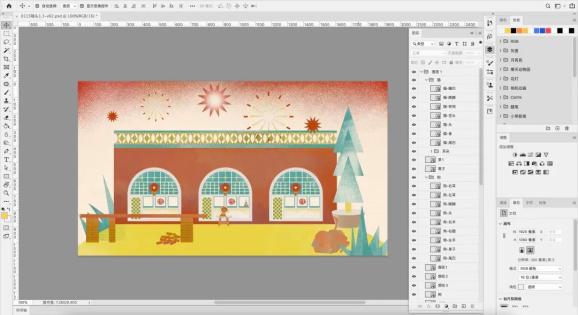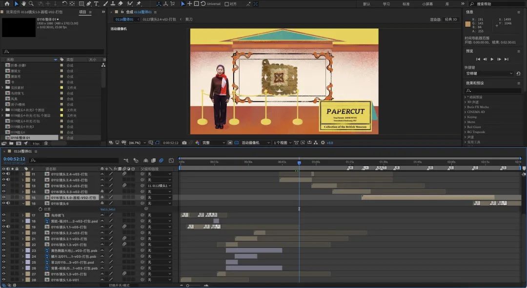 ▲ 作品工程文件为了保证全片画面风格的统一,编创团队在制作过程中没有使用第三方插画素材,而是全面采用手绘的形式进行原创绘制或者对元素进行再处理。影片的创作也经历了从“剪纸风格动画”到“讲述剪纸的动画”的转变。在指导老师的帮助下,影片从第一阶段的视觉为先逐步实现了图文贴合,画面在保证艺术效果的同时丰富了信息量,使观众能够更深入地了解剪纸这一传统民间艺术的内涵。