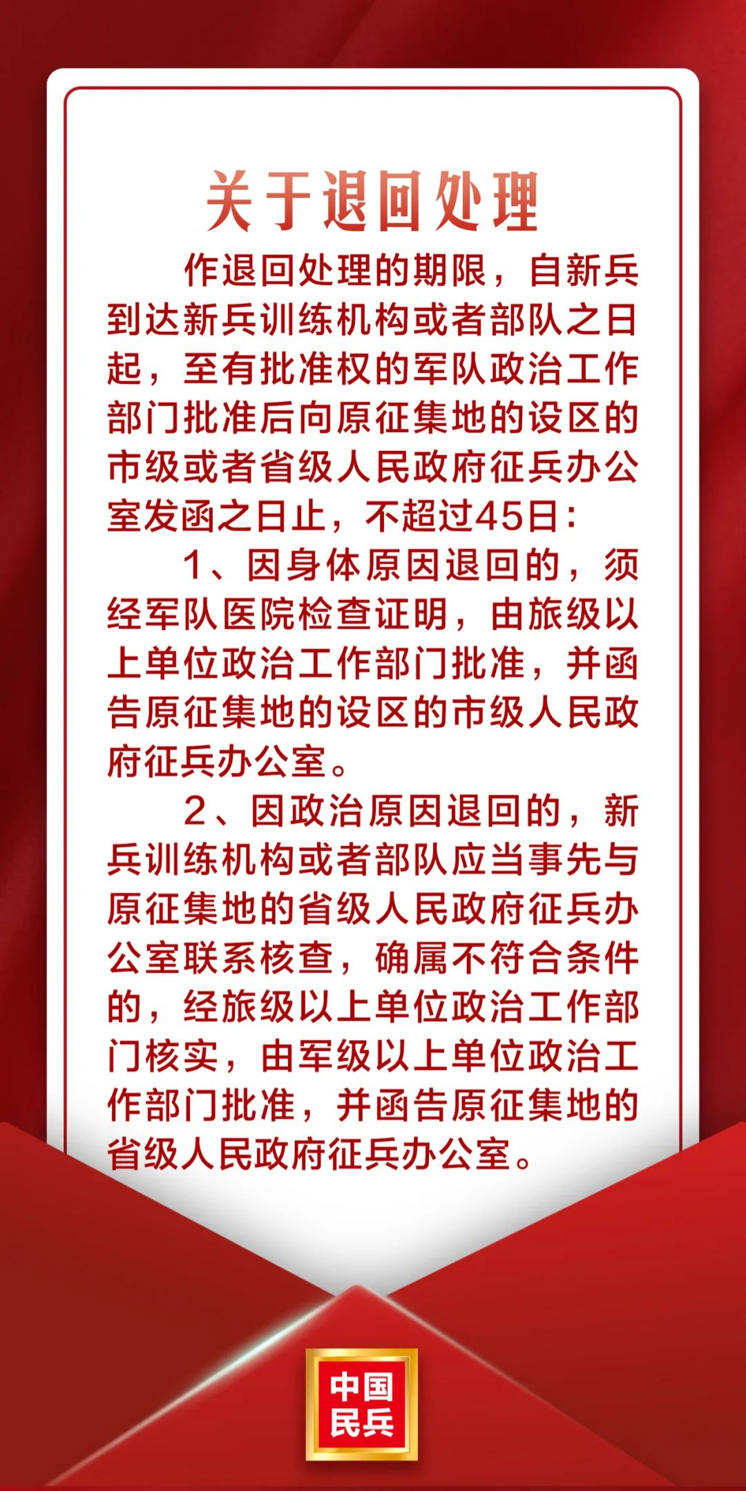 第四十九条 经检疫和复查,发现新兵因身体原因不适宜服现役,或者政治情况不符合条件的,作退回处理。作退回处理的期限,自新兵到达新兵训练机构或者部队之日起,至有批准权的军队政治工作部门批准后向原征集地的设区的市级或者省级人民政府征兵办公室发函之日止,不超过45日。