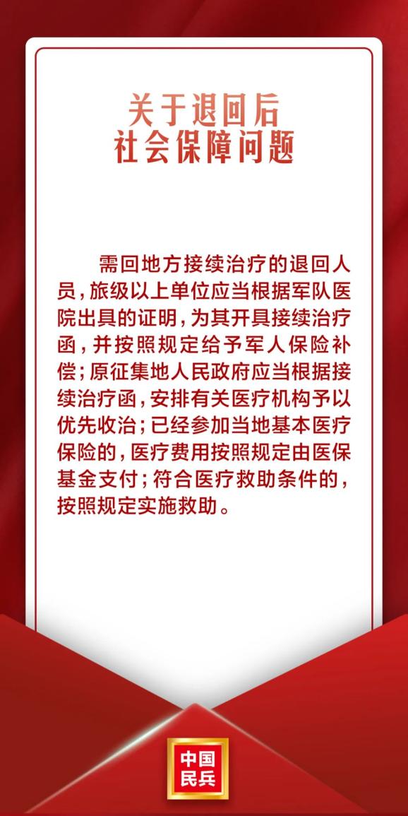 需回地方接续治疗的退回人员,旅级以上单位应当根据军队医院出具的证明,为其开具接续治疗函,并按照规定给予军人保险补偿;原征集地人民政府应当根据接续治疗函,安排有关医疗机构予以优先收治;已经参加当地基本医疗保险的,医疗费用按照规定由医保基金支付;符合医疗救助条件的,按照规定实施救助。