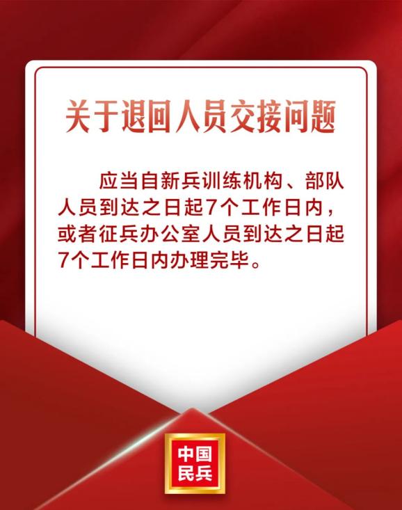 退回人员交接问题应当自新兵训练机构、部队人员到达之日起7个工作日内,或者征兵办公室人员到达之日起7个工作日内办理完毕。